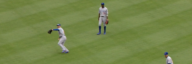 Six or seven, in fact, because just as a pop fly is a hit when it’s just shallow enough, getting beat badly on a throw gives a runner just enough time to be creative. Gordon makes a hell of a play dancing around in and behind both batter’s boxes. He’s only called out on review. It almost makes you wonder what might have happened if… no, never mind.