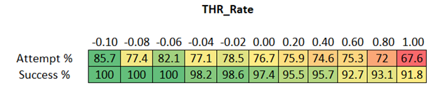 Now that we have our three variables, Sutton-Brown combined them together using a logistic regression to create an expected success rate. For these purposes we used linear terms on THR Rate and sprint speed, given the way that they correlated with success rate in the charts above (and the way that velocity works); any increase or decrease should lead directly to an increase or decrease in the probability of success. For distance, we used what’s known as a spline. This was done to capture the nonlinear effect we see in the plots, where there is nearly no change in success probability above or below some distance threshold.