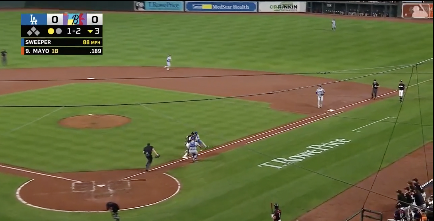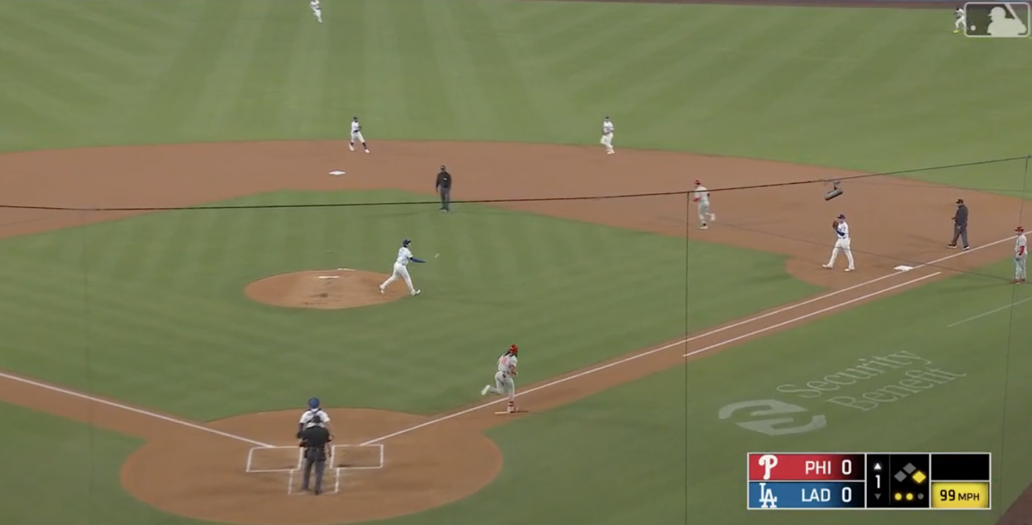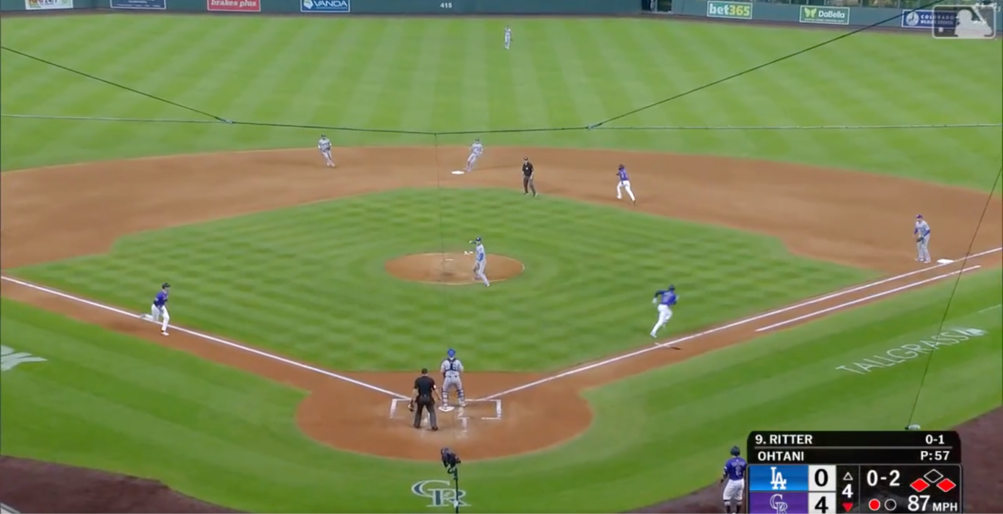 A todo el mundo le gusta criticar al lanzador. Bueno, esta captura de pantalla es engañosa, ya que la tomé después de que una línea suave se saliera del guante de Ohtani y se escapara, permitiendo que Alek Thomas llegara a primera base con un sencillo en el infield. De nuevo, se podría sugerir que nuestro héroe use mejor su guante. Y esta es la tercera vez (por precaución, pero aún así) que Ohtani ha sufrido una pausa en el juego por una posible lesión en seis jugadas defensivas. Pero, en realidad, no importa que Thomas haya llegado a base, y el equipo médico de los Dodgers probablemente dormiría más tranquilo si pusieran una de esas grandes redes de práctica de bateo delante de Ohtani y dieran por perdida cualquier línea al pitcher, sobre todo porque ponchó a los siguientes tres bateadores.