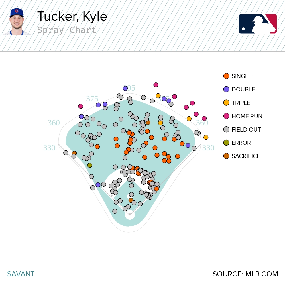 Before we get to the projections, let’s look at what Tucker’s 2025 performance would have looked like in Dodger Stadium. This is a spray chart of all his balls in play in 2025 when the Cubs played at home. This, obviously, doesn’t take into account environmental factors, but this is what his chart looked like, with Dodger Stadium as the stadium of choice.