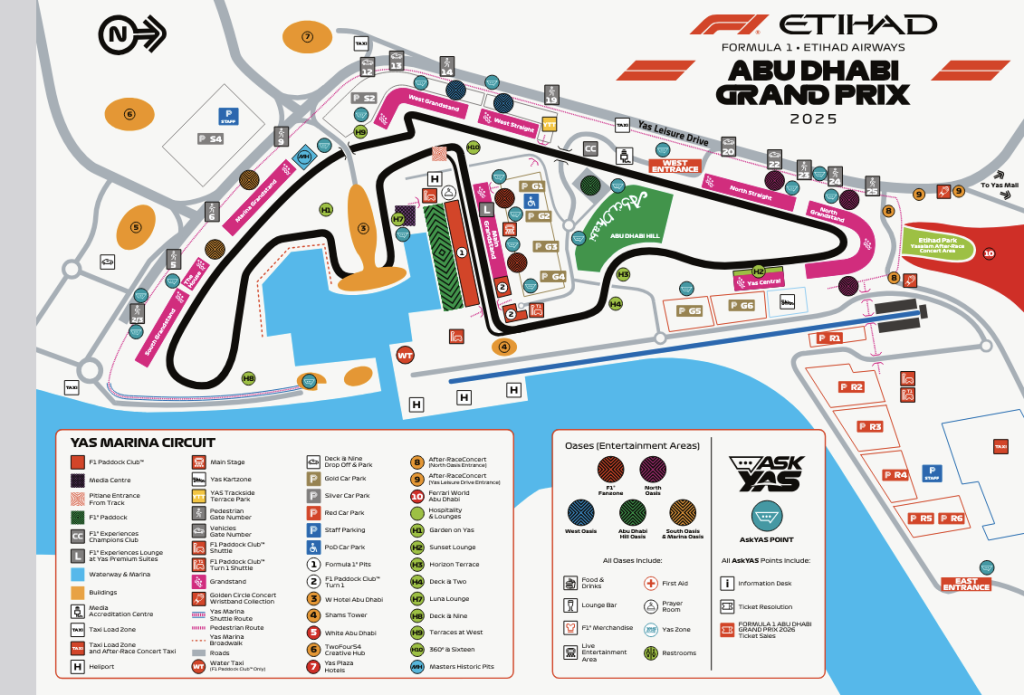Due to the unique layout of Yas Marina Circuit, the Main Grandstand is actually located on the inside of the circuit. That means you’ll need to cross the track to enter the grandstand. The closest entrance gate is Gate 19 on Yas Leisure Drive, next to the West Straight Grandstand. You’ll use a tunnel to go under the track and arrive in the fan zone behind the end of the Main Grandstand (section M-00 end), close to the final corner. If you happen to be staying at the W Abu Dhabi, you can use another tunnel which goes under the track and takes you to the same location at the end of the grandstand near the final turn. Check the detailed circuit map above.