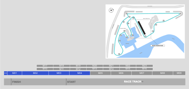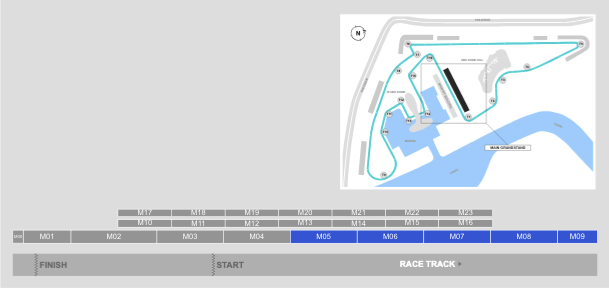 Separated into 10 Sections: M-00 to M-09. When facing the track, M-00 is furthest to the right and closest to the final corner, whilst M-09 is furthest to the left and closest to the first corner.