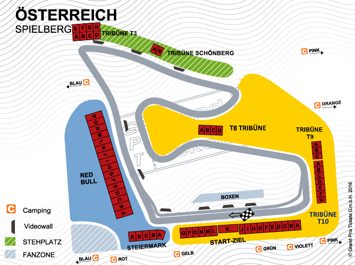 The most expensive seats are in sections Red Bull A/B, which are closest to Turn 1. where tickets become progressively cheaper. Tickets then get progressively cheaper up to section K, which is a long way up the hill towards Turn 2. The grandstand stretches up the hill to section P. From the higher sections, you also get a decent view of the infield Turns 4-5.