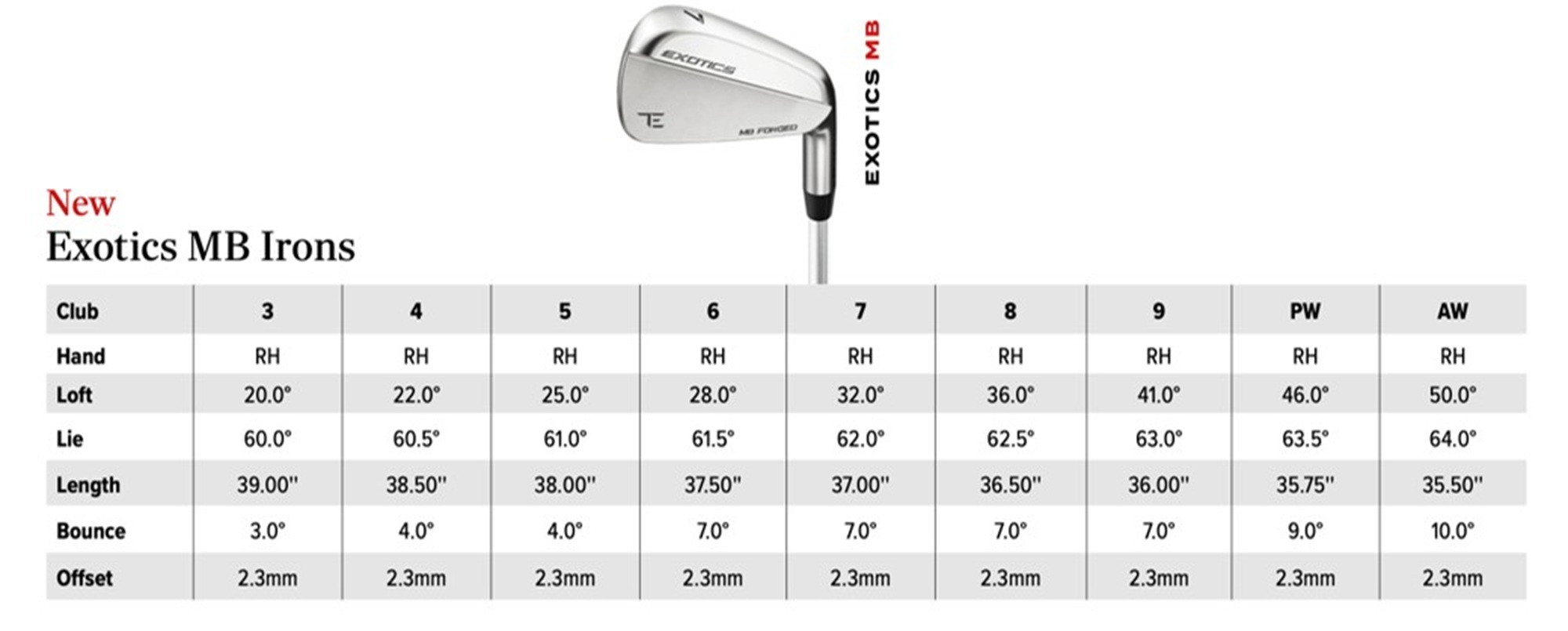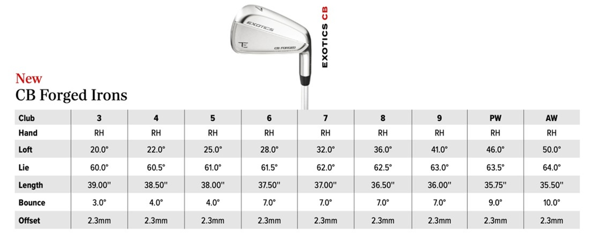 In a growing trend we’re very pleased to see, the loft, bounce and offset for the new Tour Edge Exotics MB and CB are identical across the board. That makes blending a breeze, with no bending or hinky transitions.