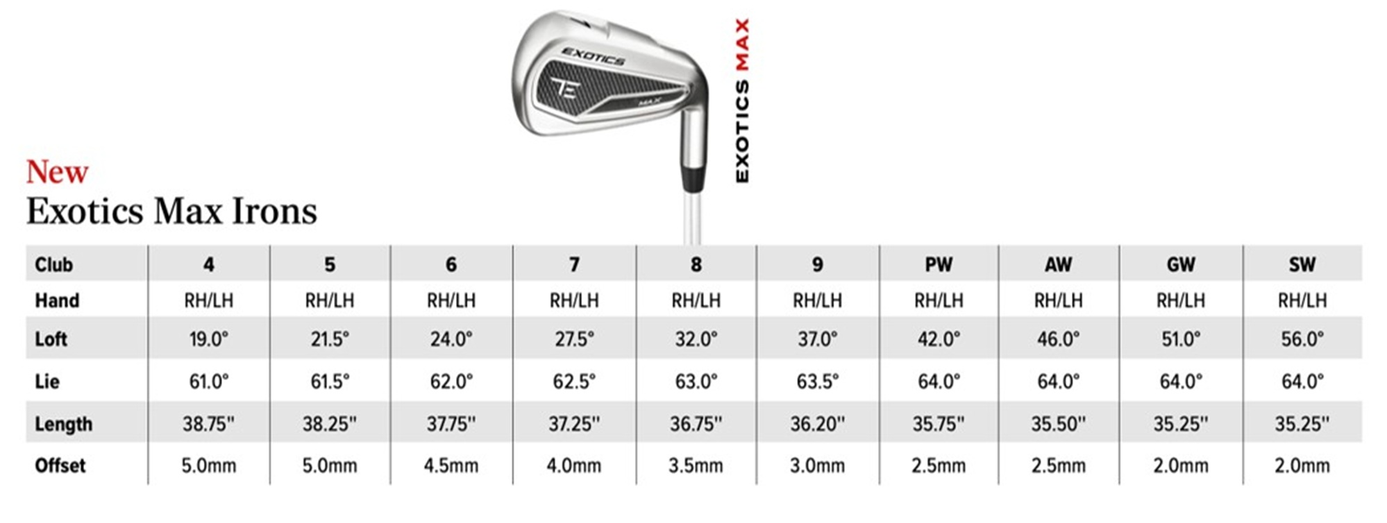 The new Tour Edge Exotics Max will be available in a 4-iron through sand wedge. The KBS Tour Lite is the stock steel shaft, with the Fujikura Blue, Red and White offered as stock graphite. Again, the Tour Velvet 360 is the stock grip.