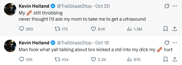 “My [nuts] still throbbing never thought I’d ask my mom to take me to get a ultrasound,” Holland added in a post on Monday.
