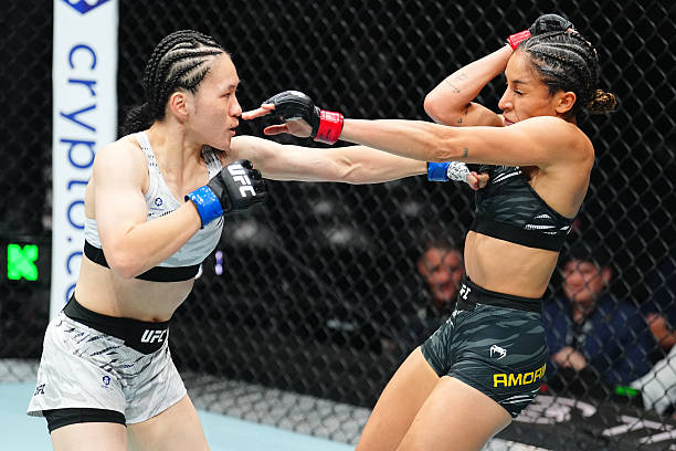Amorim came out for the third, looking extremely exhausted and desperately trying to get the fight to the ground. Clinching up, Amorim ate a series of knees and uppercuts. One of the blows seemingly took Amorim off her feet.