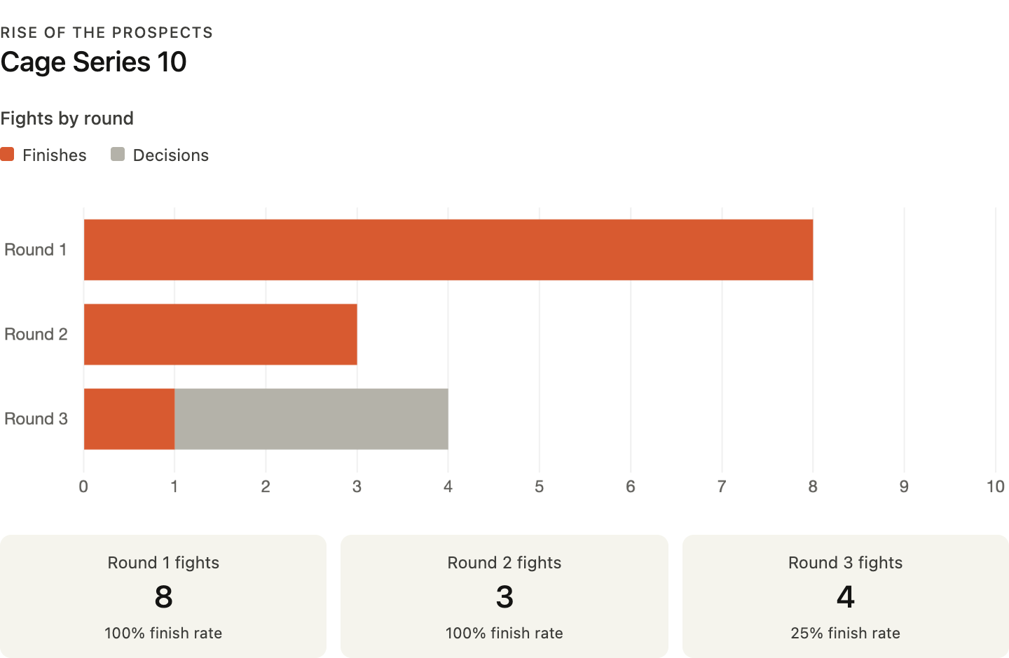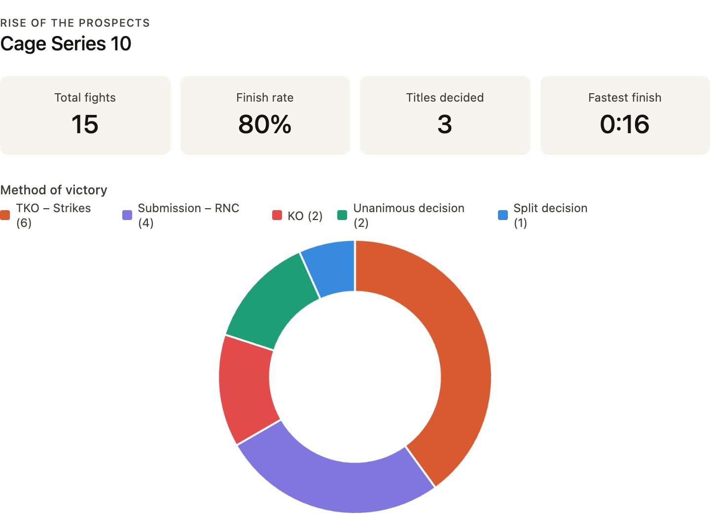 Fifteen bouts. Twelve finishes. Four rear-naked choke submissions, six TKOs by strikes, two knockouts, two unanimous decisions, one split decision.