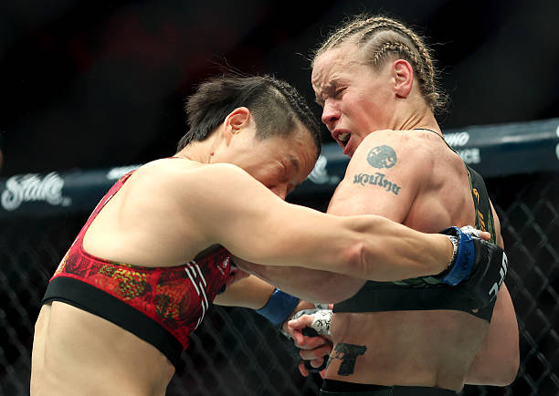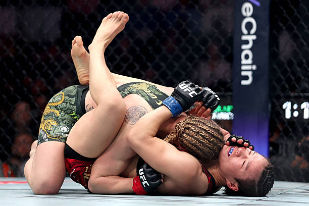 Shevchenko picked up right where she left off in the first, landing another takedown and taking side control. Once on the mat again, it became increasingly clear that the staggering size difference between Shevchenko and Zhang was a big problem for the latter.