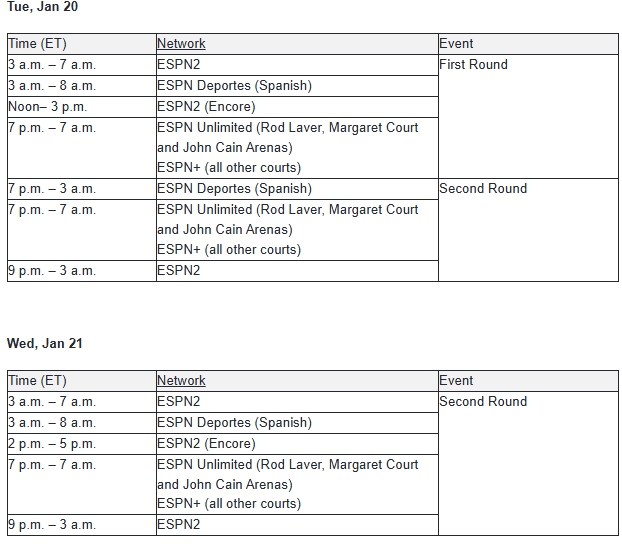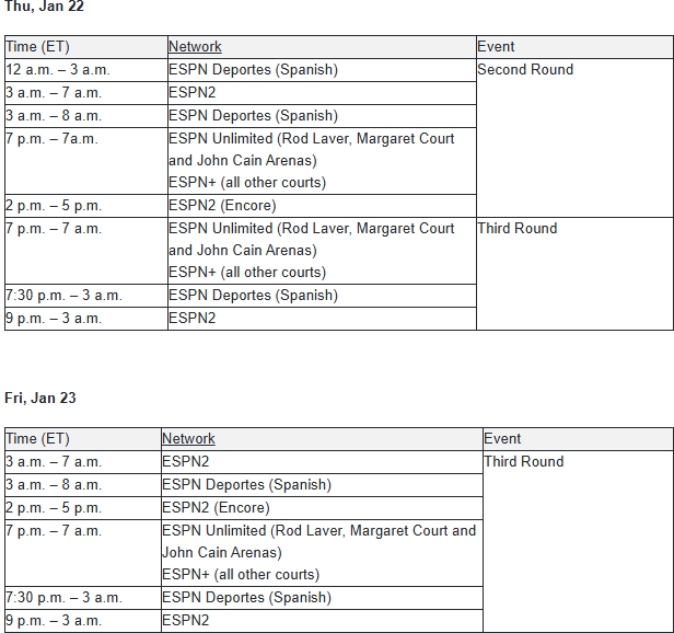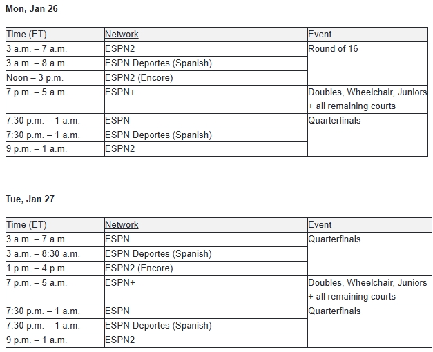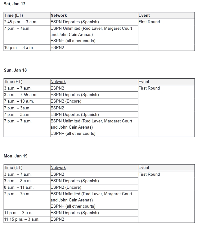 Exclusive AO coverage begins on Saturday, January 17th, with first round action beginning live at 7 p.m. on the ESPN App and on ESPN2 at 10 p.m. New in 2026, match coverage continues through the early rounds starting in primetime and ending at 7 a.m.