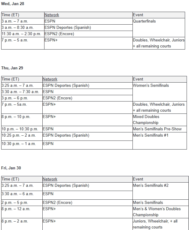 Daily three-hour encore presentations will be available on ESPN2 throughout the tournament. The Mixed Doubles Championship on Thursday, January 29th, at 8 p.m., the Men’s and Women’s Doubles Championship on Friday, January 30th at 8 p.m. as well as the Legend’s Championship at 5:30 a.m. and the Juniors Singles Championship at 8 p.m. on Saturday, Januart 31st, will stream exclusively on the ESPN App.